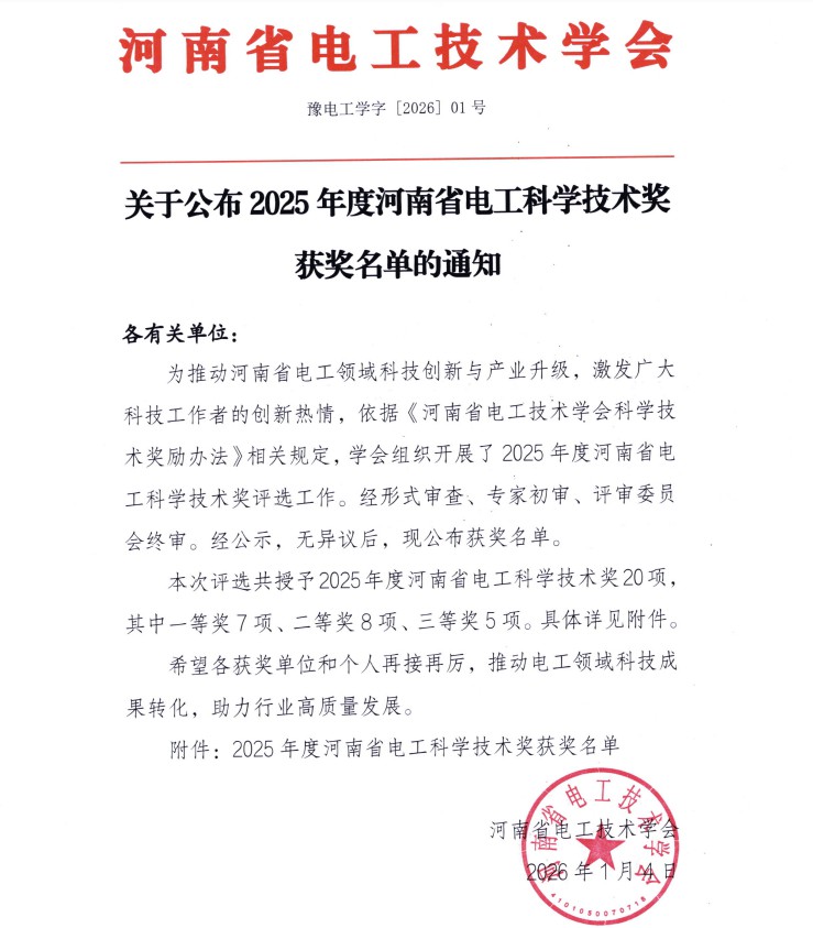 小編從河南省電工技術(shù)學(xué)會發(fā)布的2025年度河南省電工科學(xué)技術(shù)獎(jiǎng)信息獲悉,為推動(dòng)河南省電工領(lǐng)域科技創(chuàng)新與產(chǎn)業(yè)升級,激發(fā)廣大科技工作者的創(chuàng)新熱情,依據(jù)《河南省電工技術(shù)學(xué)會科學(xué)技術(shù)獎(jiǎng)勵(lì)辦法》相關(guān)規(guī)定,學(xué)會組織開展了2025 年度河南省電工科學(xué)技術(shù)獎(jiǎng)評選工作。經(jīng)形式審查、專家初審、評審委員會終審。 本次評選共授予2025年度河南省電工科學(xué)技術(shù)獎(jiǎng)20項(xiàng)其中一等獎(jiǎng)7項(xiàng)、二等獎(jiǎng)8項(xiàng)、三等獎(jiǎng)5項(xiàng)。 河南勝華電纜集團(tuán)有限公司獲得二等獎(jiǎng)。 項(xiàng)目為阻燃 B1 級耐火電纜研發(fā)及產(chǎn)業(yè)化。
